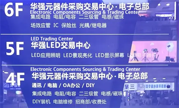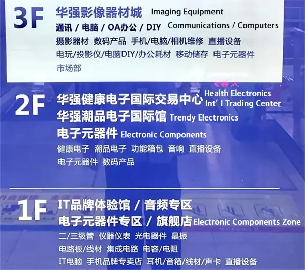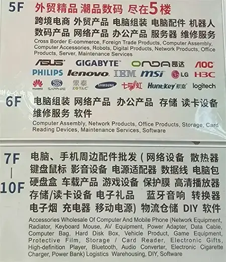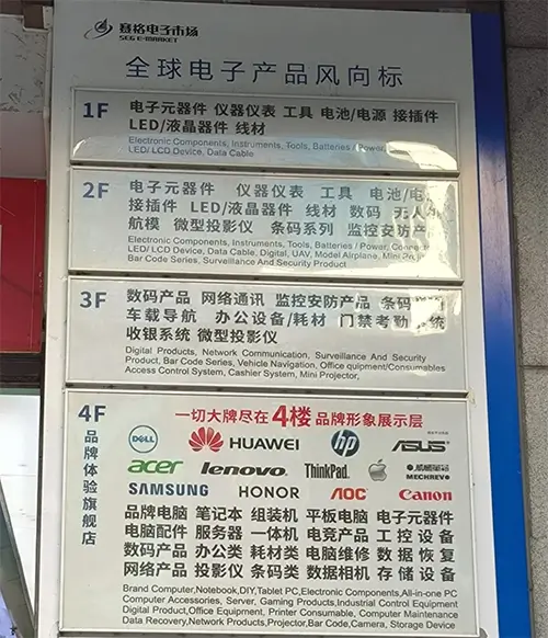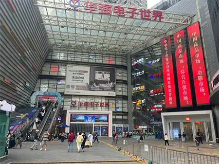 Huaqiang Electronics World (华强电子世界) is the second-largest electronics trading center in Shenzhen, featured in electronic components and secondhanded electronic products, especially known for its secondhanded computer trading market.
